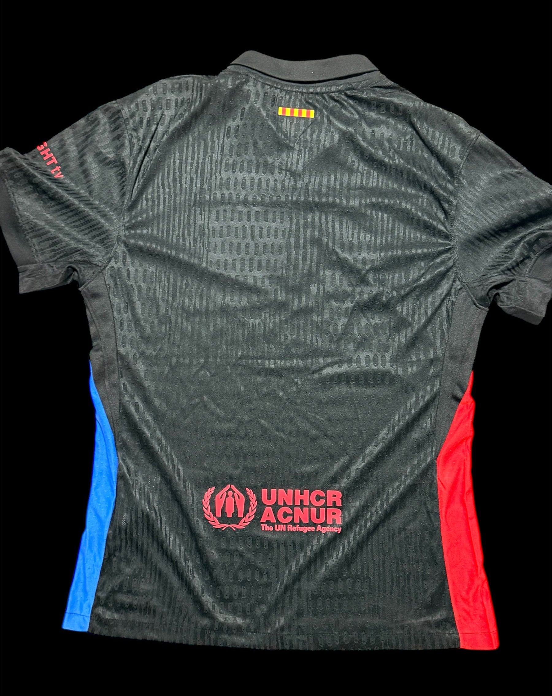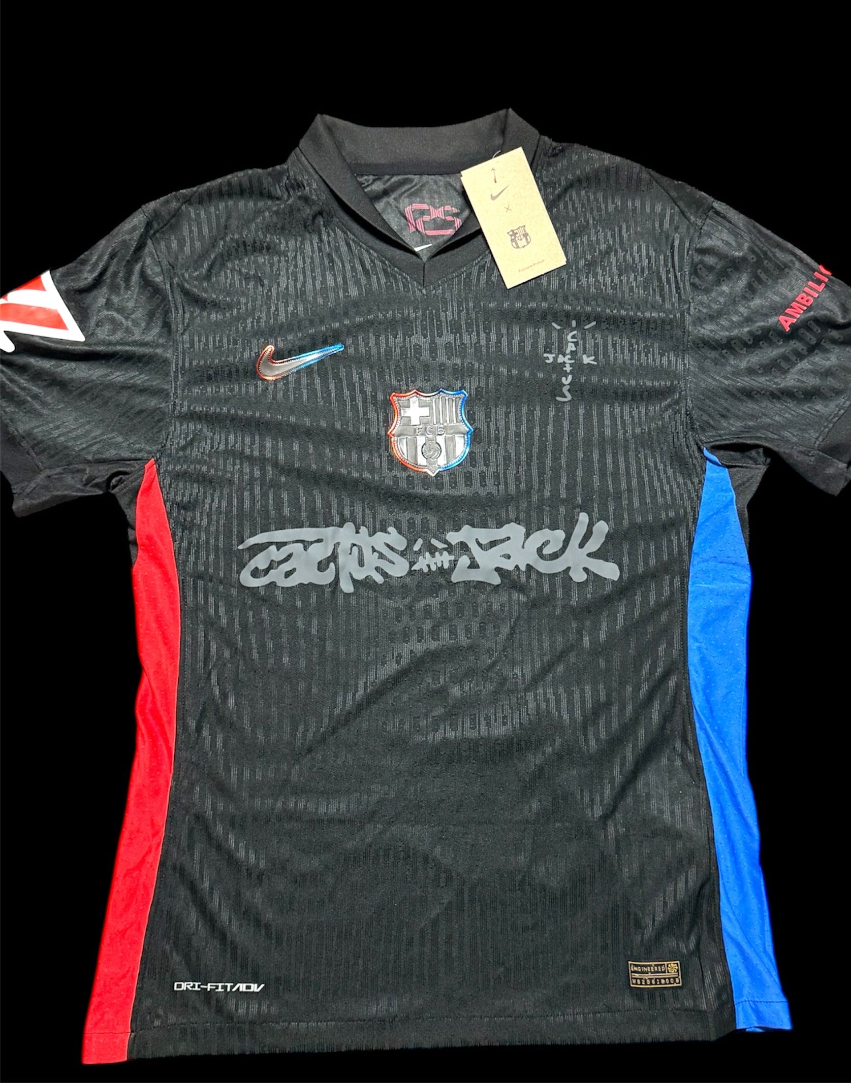 Inspirada en la colaboración entre el Barça y Travis Scott, esta versión alternativa destaca por su diseño total black con detalles en tonos oscuros y acentos del sello Cactus Jack. El escudo del club aparece en estilo blackout, y el logo de Cactus Jack sustituye al patrocinador tradicional, creando una mezcla entre moda urbana y espíritu culé.